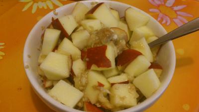 Man kann das ganze auch mit anderem Obst machen. Ich hab neulich 2 Hand voll Johannisbeeren mit 2 Blättern Minze zerdrückt darauf getan. Ist allerdings etwas sauer und ich bevorzuge dann doch den Apfel ;)